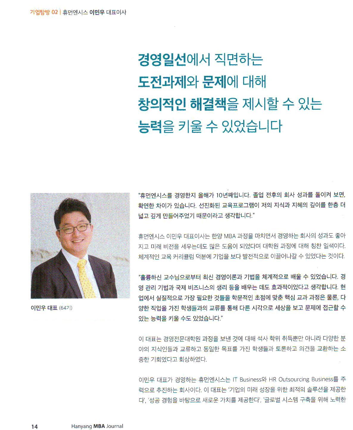 | 휴먼엔시스 HANYANG MBA journal 기업탐방 소개 | 휴먼엔시스 | 2013-03-28 오후 4:30:10 | |