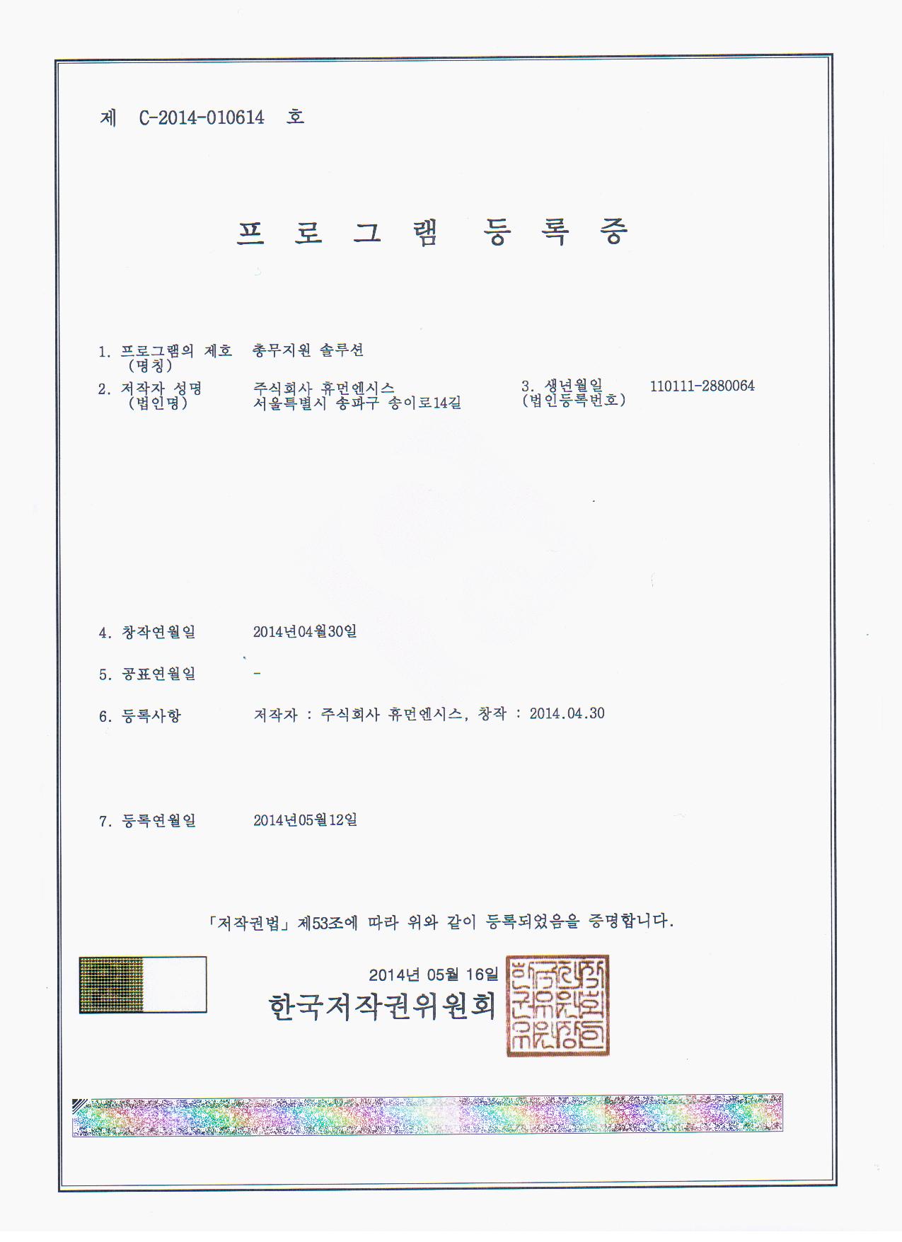 | 한국저작권위원회 총무업무지원솔루션 프로그램등록 | 휴먼엔시스 | 2014-05-16 오후 4:25:24 | |