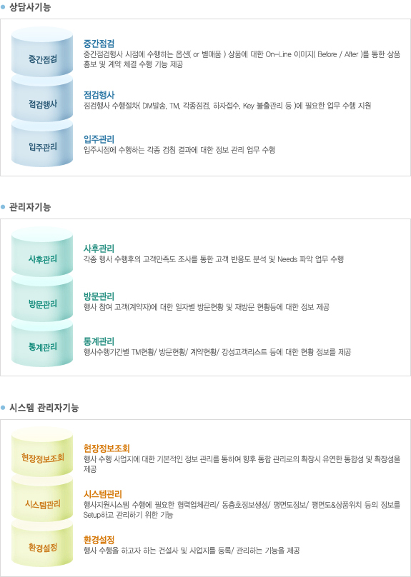 행사지원시스템은 최근 건설 경기에 대한 정부의 각종 규제 및 부동산 시장 억제 정책에 따른 시장환경의 어려움과 더불어 인터넷의 보급으로 인한 주택 계약자 및 입주자들의 의식 고취에 따라 고객의 성향 및 패턴의 이해와 상품에 대한 고객의 Needs 파악이 건설업계에서의 필요성으로 대두되게 되었습니다. 이러한 환경에서 주택사업과 관련된 고객 접점 시점에 해당하는 각종 행사수행(중간점검/ 사전점검/ 입주행사) 시 고객에 대한 이해와 한 차원 높은 고객 서비스 수행을 통하여 고객만족도 극대화 및 브랜드 인지도 향상을 위하여 체계적인 행사 수행에 필요한 시스템의 필요가 대두되게 되었습니다. 행사지원시스템은 이러한 건설 행사 수행 환경에서 업무의 효율성을 높이기에 가장 적합한 활용 솔루션입니다. |